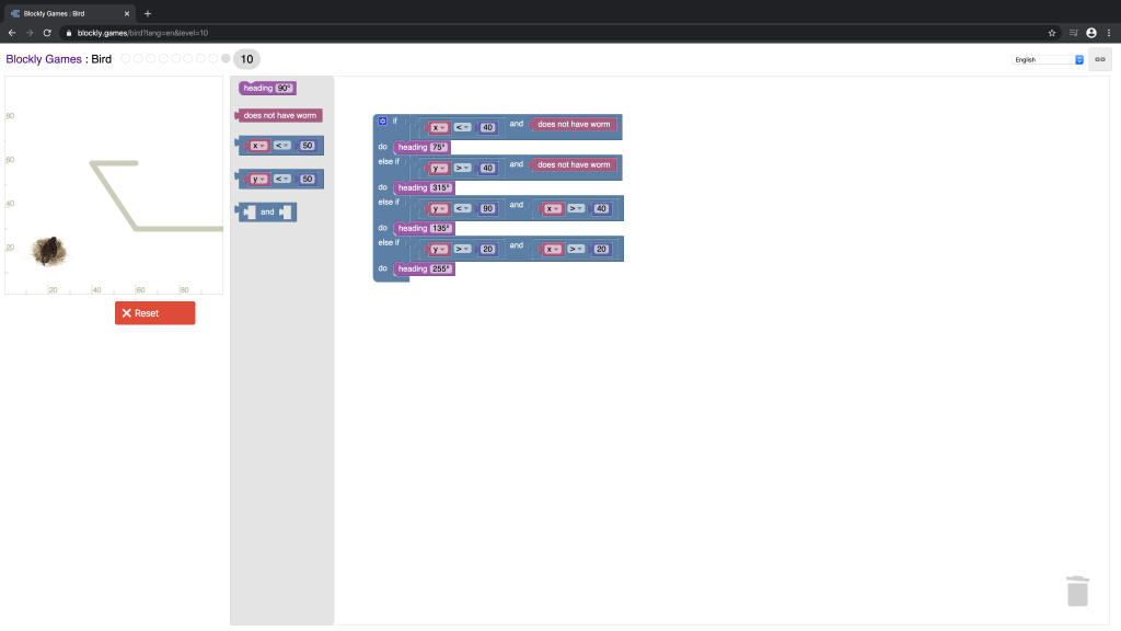 Blocky games-The Bird Posted byhenrique015espmJanuary 14, 2020Posted inUncategorized This was TOOO EASY, so here just the link and the photo: https://blockly.games/bird?lang=en&level=10#bktw7f Share this: Click to share on X (Opens in new window) X Click to share on Facebook (Opens in new window) Facebook Like Loading... Related